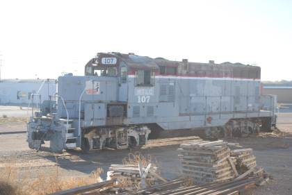 West Texas and Lubbock GP7 107, ex. Texas Northeastern 107, exx. Intermountain Western 107, exx. Missouri-Kansas-Texas 107, nee Missouri-Kansas-Texas 1517, built by Electro-Motive Division in 1951.