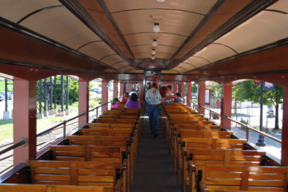 Strasburg Railroad open air car "Hello Dolly", nee Boston and Maine coach 856 built by Pullman in 1896. It arrived in Strasburg in 1966 and two years later, was prominently featured in 20th Century Fox's production of the movie- musical "Hello, Dolly!" and was named in honor of this.