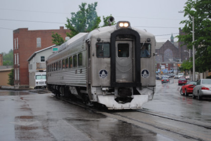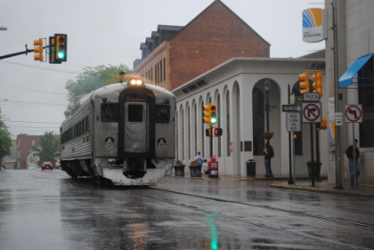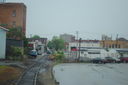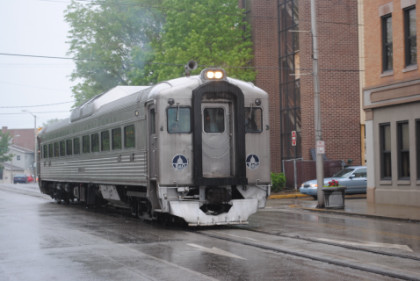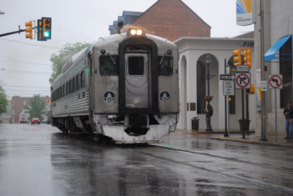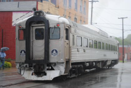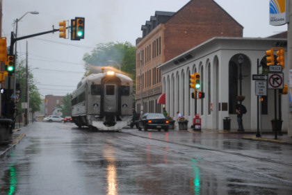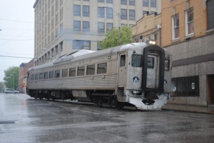 The end of track. The RDC reversed and dropped us off in a driving rainstorm to do a walking-down-the-street photo runby through downtown Uniontown as it made its way back down Beeson Avenue.