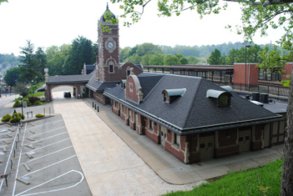 The Pennsylvania Railroad Greensburg station built in 1911 and was part of a project to elevate the right-of-way as it passed through Greensburg. William Holmes Cookman served as architect. The depot is constructed of red brick laid in a Flemish bond pattern with stone trim and quoins on the building's corners; the overall architectural style is Jacobean Revival. A copper ogee dome with a finial tops a tall square clock tower. Ornamented parapets with center cartouches and corner finials surround the dome.