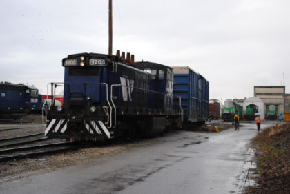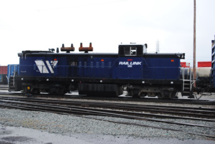 Southern Railway of BC GMD1 1203, ex. Canadian National 1169 1987, nee Canadian National 1069 built by Electro-Motive Division in 1960, was switching cars this morning.