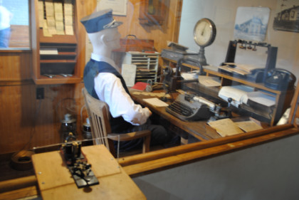 Telegraph key and station master inside the Big Lick station.