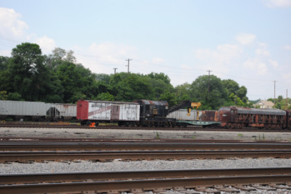 Southern Railway Jim Crow Car 1662, Central of Georgia SD7 197, a Conrail crane and Conrail SDP45 6670, originally Erie Railroad. From here, Bev drove me to the Shaffers Crossing yard tower on the hill on the west side of the yard.