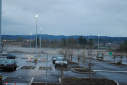 The Wilsonville station parking lot and a low level of fog.