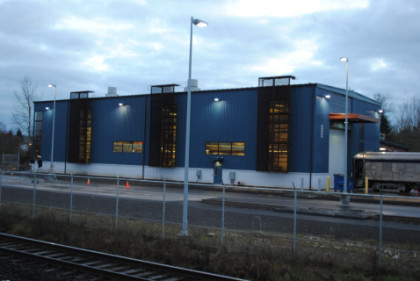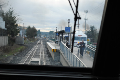 After this picture I boarded for my trip to Wilsonville. About ten minutes later, we proceeded south for my first trip aboard this unique train service. The first stop was Hall/Nimbus which was followed by the Tigard Transit Center, where we met Car 101 on its way to Beaverton. Our train passed a small yard of the Portland and Western Railroad on this pre-dawn trip south. Next we stopped at Tualitan before we made our way out to Wilsonville where I would be laying over and getting pictures.