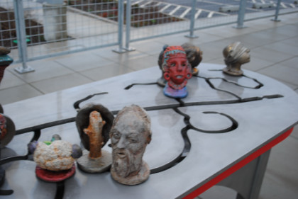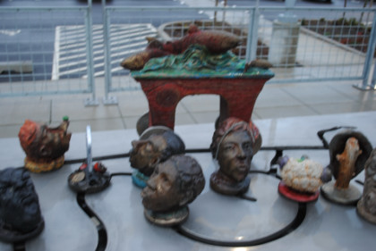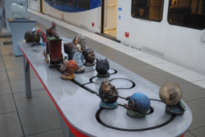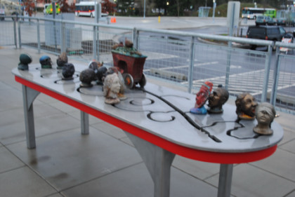 This is an interactive sculpture created by Frank Boyden and Brad Rude which features bronze heads and a vehicle designed to represent the train and the variety of people who ride the line. Other stations along the route feature different art and sculptures.
