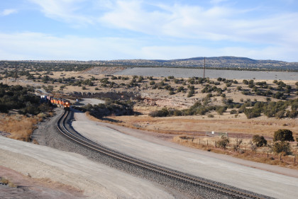 I followed Randy's excellent directions then ran into his wife Marie, who pointed me to Randy waiting in the car. We left by driving south to Belen on Interstate 25 then east to join up with US Highway 60, which we would also take east. We drove through Abo Canyon and stopped at the highway bridge at the east end and had a red-over-green signal so we waited for the train.