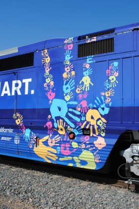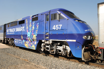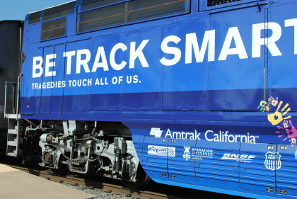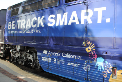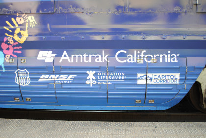 The emblems of Caltrans, Amtrak California, Union Pacific, BNSF, Operation Lifesaver and Capitol Corridor.