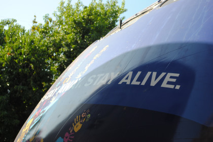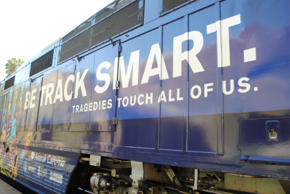 A closer view of the slogan "Be Track Smart. Tragedies Touch All Of Us."