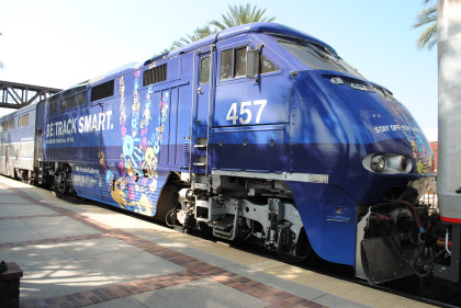 The slogan is "Be Track Smart. Tragedies Touch All Of Us." I reboarded and we left Fullerton then at Irvine, our conductor gave me permission to photograph the locomotive at Irvine if I was quick.