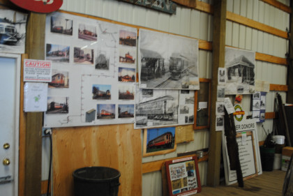 Pictures on the end wall of the 3,000 square foot car barn. After that we were presented with a few gifts to remember our visit then we went outside and after several attempts to start their speeder, it finally kicked over and I received the first ride on their 200 feet of track.