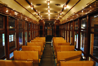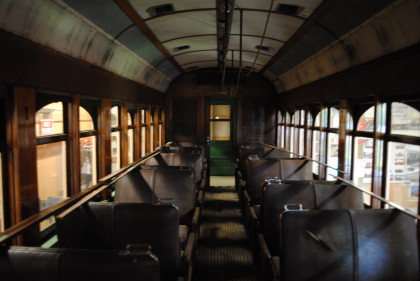 Its interior, with seats and partitions removed, resembled a well-appointed living room, with carpet, curtains, and upholstered chairs, mostly in cream and green. The orange glass of the upper arches of the windows was masked by the curtains, and red light bulbs were strategically installed elsewhere to resemble an open fire in a grate.