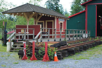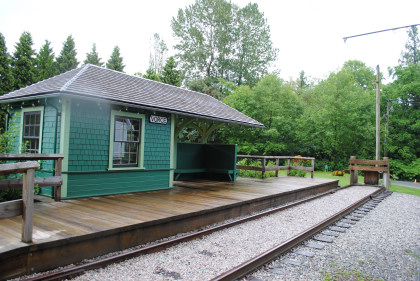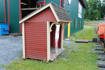 The little station was constructed and used previously by the now-defunct Steveston Interurban Society in conjunction with their speeder rides and was donated by the Fraser Valley Railway Historical Society to West Coast Railway Association in Squamish.
