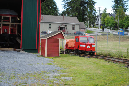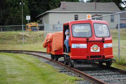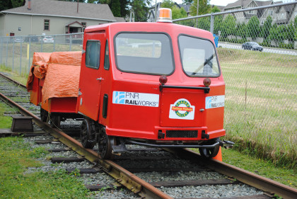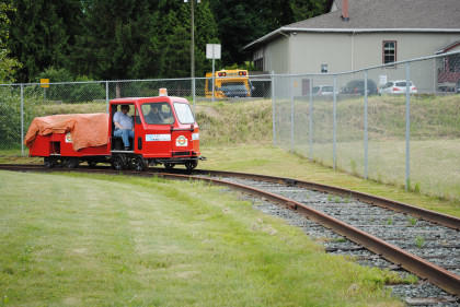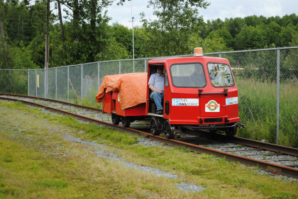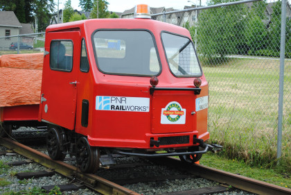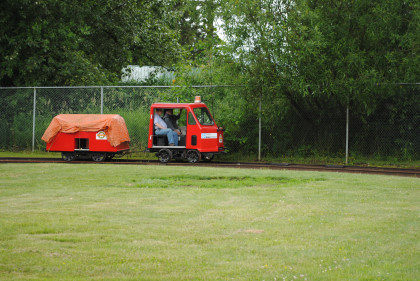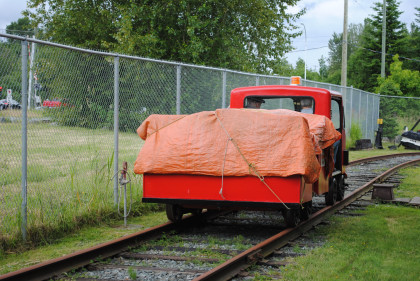 Fraser Valley Heritage Railway speeder FVR-1 built by Woodings, which has an 18 horsepower Tecumseh engine and a variable speed drive, similar to a snowmobile. The speeder was originally used as an inspection or foreman's ride and was donated by PNR Railworks. This and a trailer give rides over the 200 feet of track.