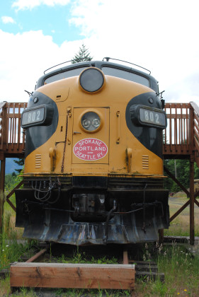 Spokane, Portland and Seattle F9A 802, ex. Burlington Northern rotary snow plough power unit 972569 1981, exx. Burlington Northern 782 1973, exxx. Burlington Northern 9816 1970, exxxx. Northern Pacific 6704A 1965, nee Northern Pacific 7013D built by Electro-Motive Division in 1956. While in passenger service, it pulled the Vista Dome North Coast Limited passenger train between Chicago and Seattle. It was retired in 1998 and BNSF donated the empty carbody to the Columbia Gorge Interpretive Center Museum for static display and it was painted and lettered Spokane, Portland and Seattled. However, this railroad did not own any F9As.
