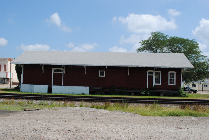 The Chicago, Burlington and Quincy wooden freight house in Bushnell. We drove west and as we came into Good Hope, saw a Peoria & Western train slowing moving east. We drove back to the next grade crossing east and set up but the train stopped to switch and as we could not wait, kept going west.