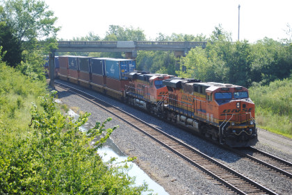 After La Harpe, we turned on Illinois Highway 94 south to US Highway 136, crossed the Mississippi River into Iowa, then drove south into Missouri. As we crossed over the BNSF bridge at Medill, we saw an eastbound train coming so drove into Medill and set up.