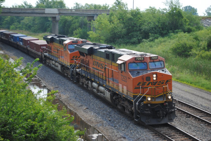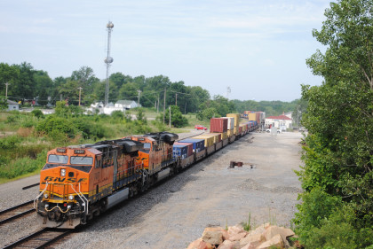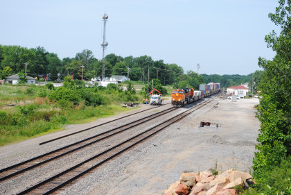 BNSF 7489 East with brand new BNSF 7453 was slowed by a work gang near the grade crossing next to the La Plata station.