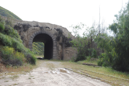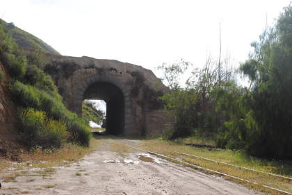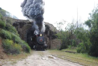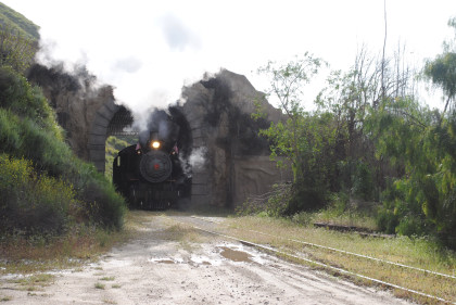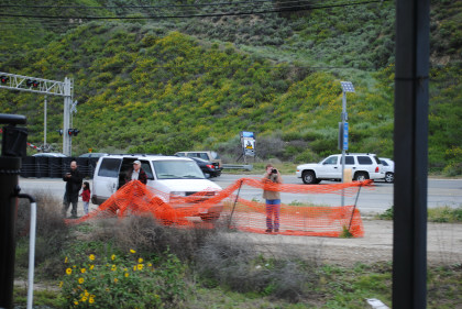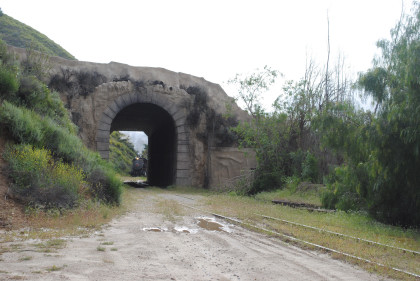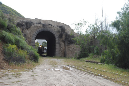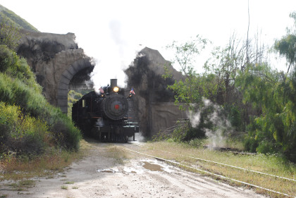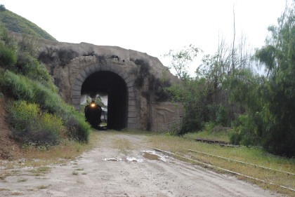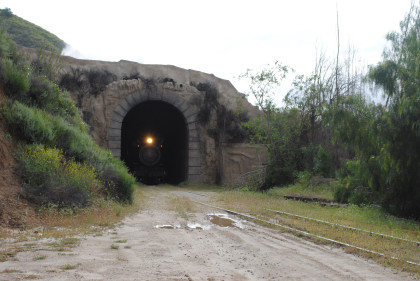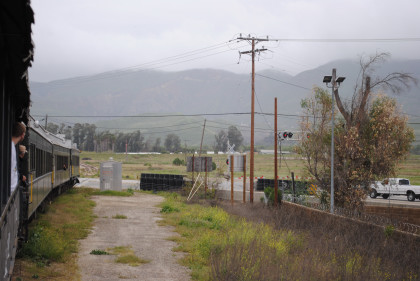 Looking back towards Fillmore. It was announced that our photo runby location would be the fake tunnel and we should be careful of the mud. The location I would have used was a levee which was dry and the photo line would have been out on it and the sun's angle would have been perfect with the mountains behind. We left Fillmore Fish Hatchery Road and returned through the tunnel, where we all detrained.