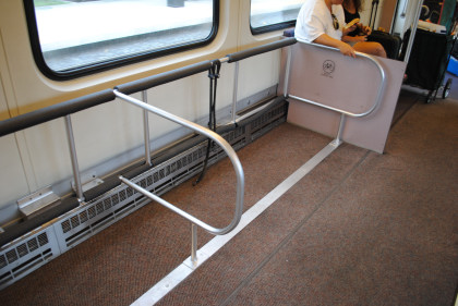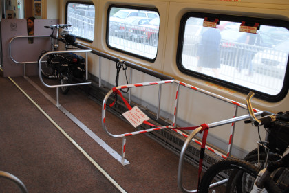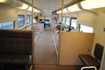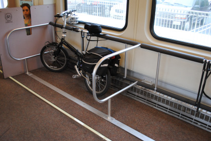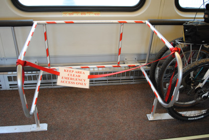 Metrolink adds bike storage to rail cars 2011-08-12As part of a pilot program, Metrolink will introduce its first two bicycle cars, passenger rail cars outfitted with space for at least 18 bicycles rather than two bicycles like Metrolink's other rail cars. The agency hopes this will encourage more bicyclists to take the train to their destination. To accommodate the additional bicycles, Metrolink crews removed 29 passenger seats from the bottom level of one of its rail cars, which traditionally seats up to 149 people. Metrolink used in-house resources to design and retrofit existing cars with additional storage for bicycles. The agency worked with bicycle advocates on the design, which was ultimately approved by the Federal Railroad Administration. Initially, Metrolink's bicycle cars will debut on the Inland-Empire line weekend beach trains, where the demand is highest for additional bicycle space. Bicycle cars can be identified by yellow decals on the outside of the rail car. Metrolink is prepared to add up to 10 additional bicycle cars to its fleet, depending on the success of the pilot program.