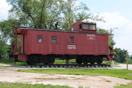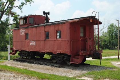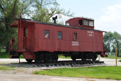 Chicago, Burlington and Quincy caboose 13979 in Novinger, which we do not believe is CB&Q, but cannot locate its history.