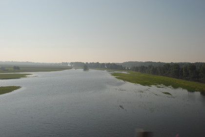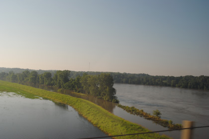 The train crossed a very full Missouri River with minor flooding north of the levee.