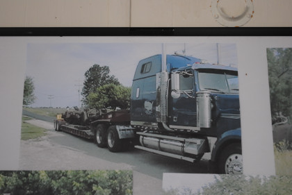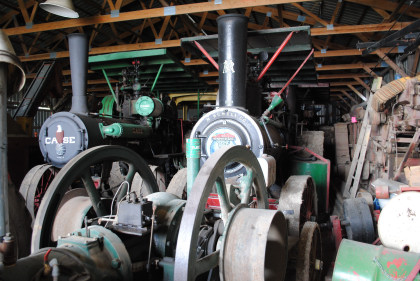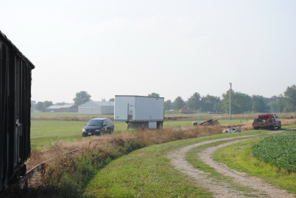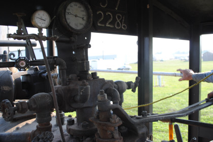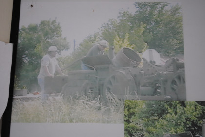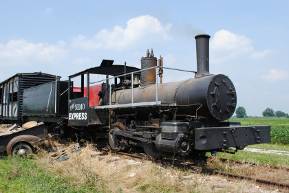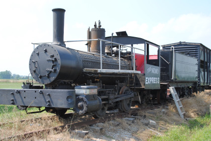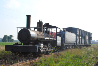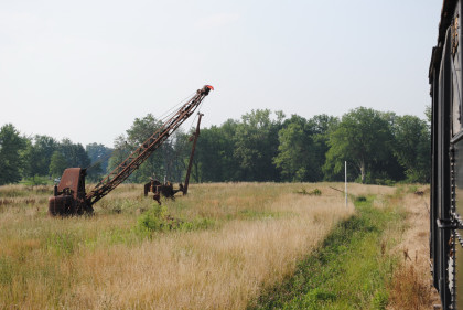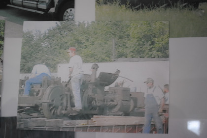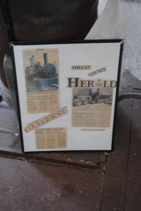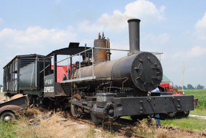 The Threshers own a lot of unique equipment. We returned to the engine but it still needed to build more steam so I loaded more wood and Bill stoked the engine. After that, I ran over to Casey's for a Coca-Cola before we returned to watch the boiler pressure continue to grow. Once it was over 40 pounds, Bill pulled the reverser back and the engine started to move backwards to near the end of the track where Bill stopped it and I detrained for a picture.