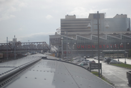 I awoke to a rainy Kansas City as I arose and made the corrections to my story. After preparing myself, I checked out of the Westin Crown Plaza Hotel and took the Air Walk back over to Kansas City Union Station then walked through the station to the freight house bridge. Union Pacific 844 was steamed up and ready to go to Jefferson City via the Union Pacific River Line this morning.