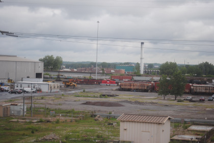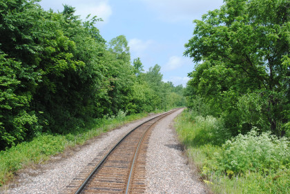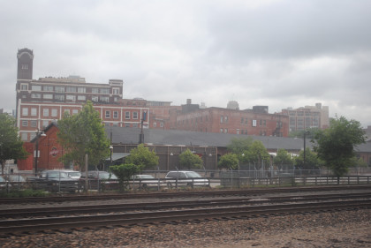 The former Milwaukee Road freight house is now a barbecue restaurant. We made our way east down the Kansas City Terminal tracks and had a yellow signal followed by a red signal and stopped, but only briefly. A few miles later the train went up and over the flyover across the Union Pacific and Kansas City Southern. We would be running at a slower speed than normal to let the new bearings break in.
