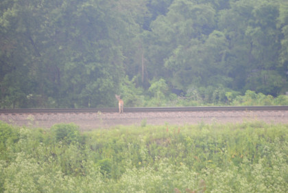 This deer was railfanning the steam train. BNSF wanted our train information and soon we were on our way again, passing through Congo where many BNSF freight trains were on the rails today. We had our first chaser of the trip after Rock Creek then passed through Cement City and continued east where we stopped agian.