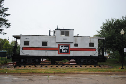 Chicago, Burlington and Quincy caboose 13569 built by International Car in 1964 is on display east of the station.