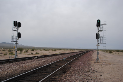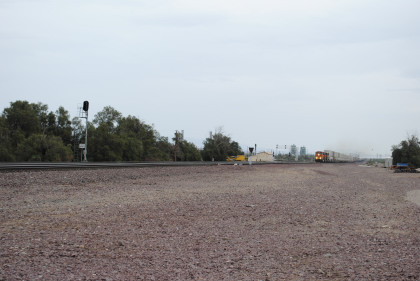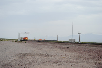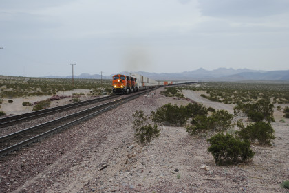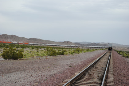 BNSF 7516 West at East Pisgah. From here we drove to Daggett where the railroad was down to a single track between Daggett and Newberry Springs today for track work on the south track. There was a Union Pacific train waiting to enter the BNSF mainline.