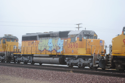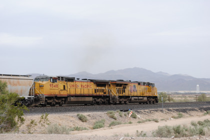 Union Pacific 5467 East in the rain and wind at Hesperia.