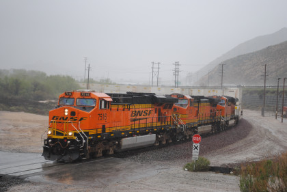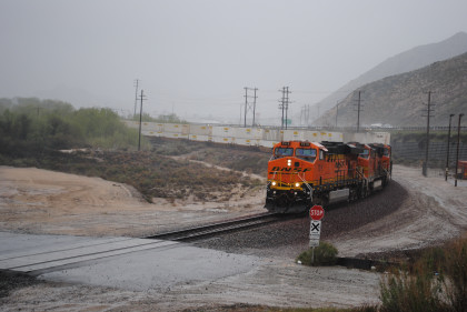 BNSF 5363 West. From here we had an extremely windy, turning into rainy, drive on Interstate 15 which, when traffic came to a stop, we exited at Bear Valley Cutoff and would come back through the Summit Valley.