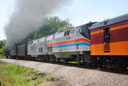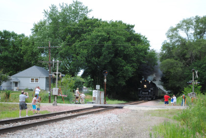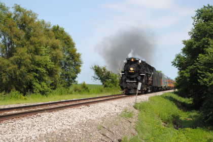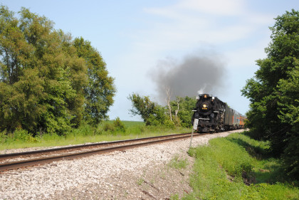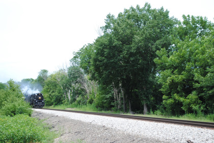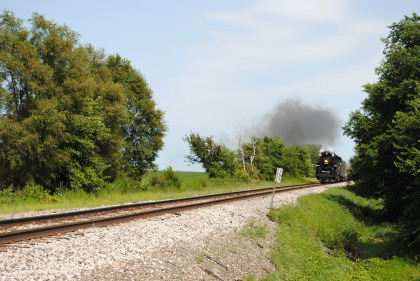 Nickel Plate 765 was really on the move coming through Colona. We then went on US Highway 6 to give chase but all we saw was smoke ahead of us so unless something happened, those would be our two runbys. Keith knew that the bridge was out on US Highway 6 east of Sheffield so we turned south into Buda then went east on 1200 Avenue, where we received a phone call that the train had stopped and made it to the next grade crossing, joining the other photographers.
