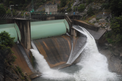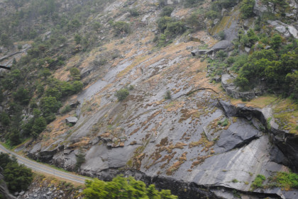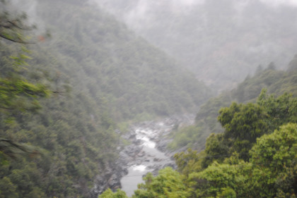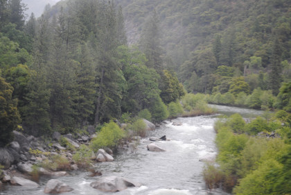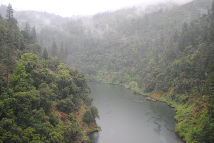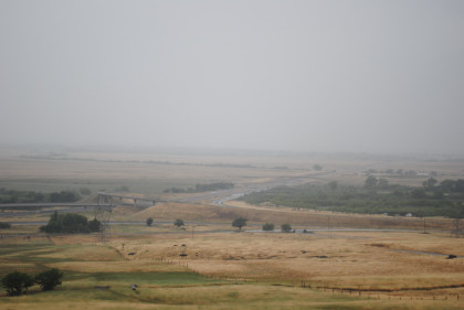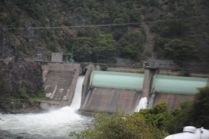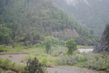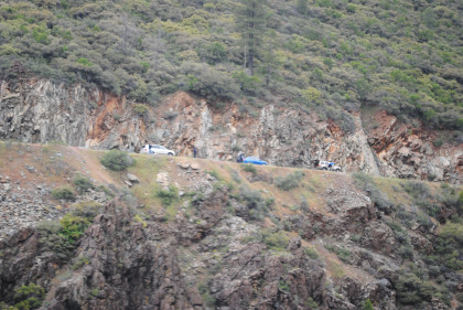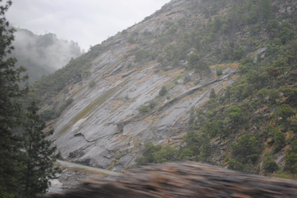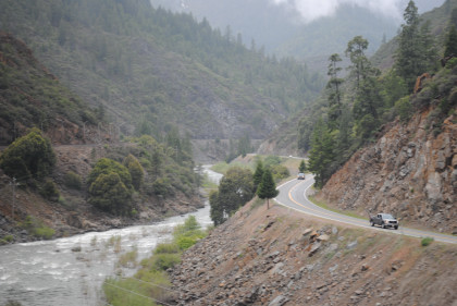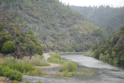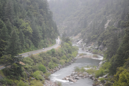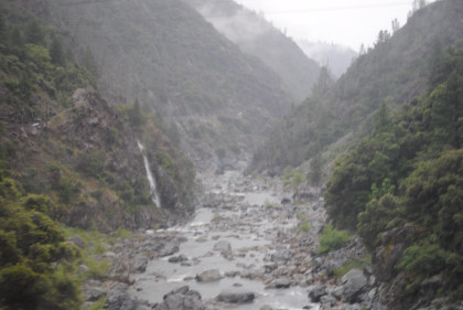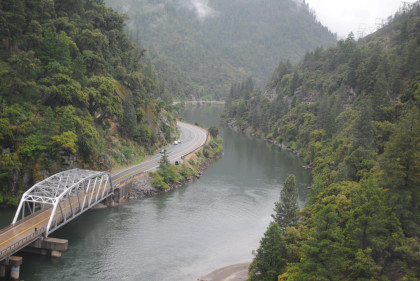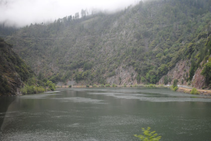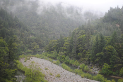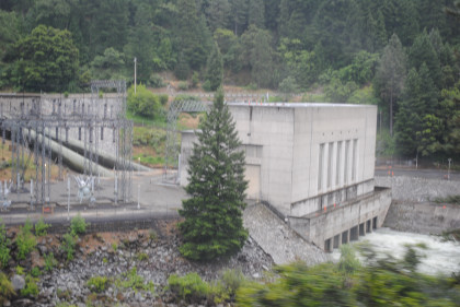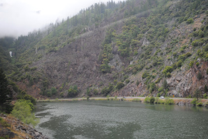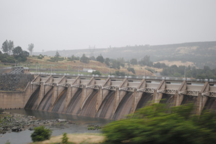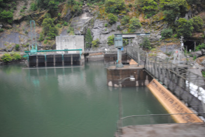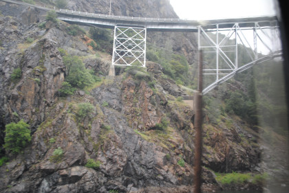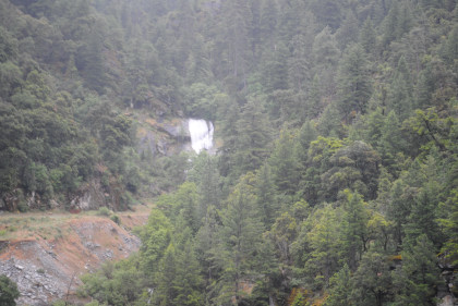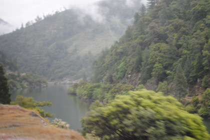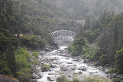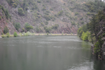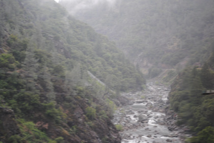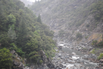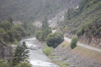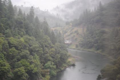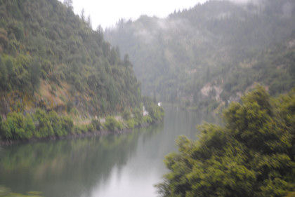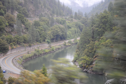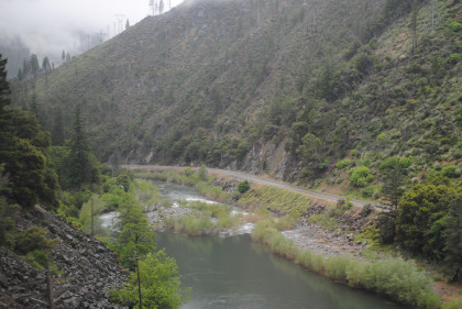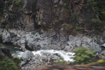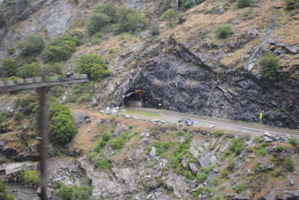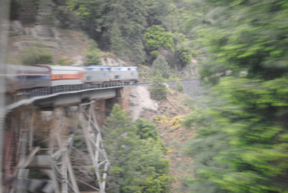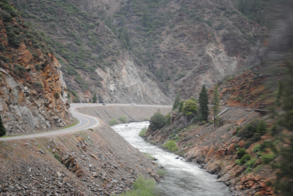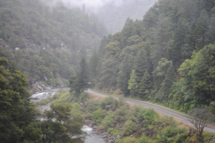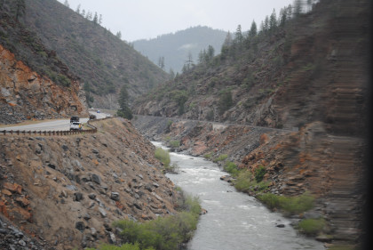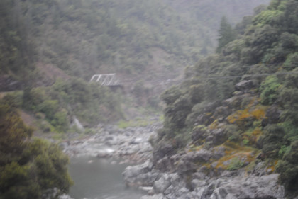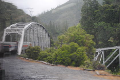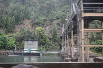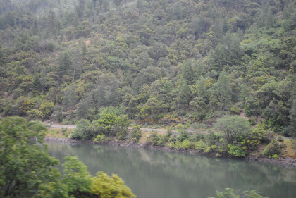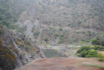 Climbing the grade below Table Mountain after which the train went under Highway 70 and into Tunnel 4, which reverses direction, so when we exited, we were at James Siding. Next we took the lower level of the Highway 70 bridge of the West Branch of Lake Oroville.