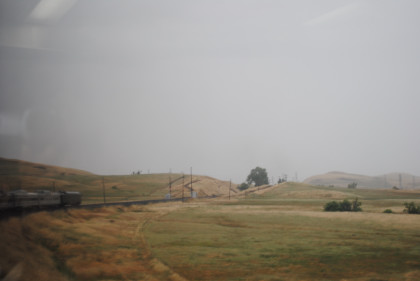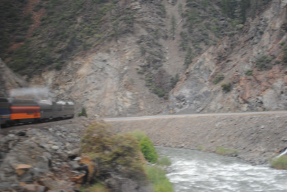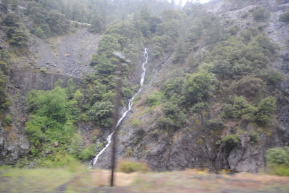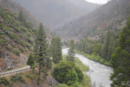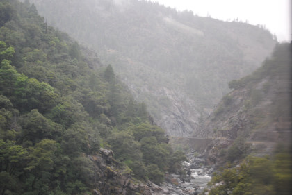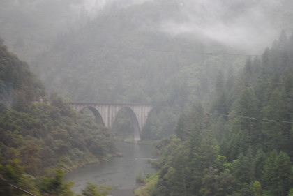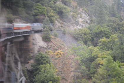 I was feeling so much better after a good deep sleep and arose at 6:30 AM so had almost nine hours sleep. After picking up some toast and taking it back to my room, I put the corrections in my story from yesterday. We had a few friends stop by the room and we talked about previous NRHS Convention trips in Chattanooga. After that we went down to the lobby and checked out, leaving our bags there and more stories were exchanged as we waited for the bus to arrive, which only took 25 passengers. I was the second passenger aboard and Chris followed us on another bus ten minutes behind. Back at the Western Pacific station here in Oroville, I waited under my umbrella for the train to arrive then everyone boarded and we waited for departure which occurred at 9:03 AM.