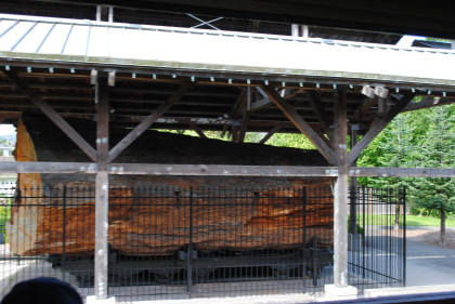 Log car in the Centennial Log Pavilion. Although not part of the railway museum, it indicates the importance of the lumber industry to the town. During the 1850's, English settlers moved into the area that would become Snoqualmie and began farming, but others soon saw the commercial potential of the huge stands of fir, spruce, hemlock and cedar in the adjacent mountain forests. The first lumber mill was established at the mouth of Tokul Creek around 1872 by Watson Allen. Five years later, there were twelve logging operations on the Snoqualmie River and, within fifteen years, logging and mill work was employing one hundred and forty men and sending millions of board feet of lumber down the river. The Snoqualmie Falls Lumber Company (later the Weyerhaeuser Timber Company) opened a mill about a mile north of Snoqualmie in 1917, and the wheeled carriage is similar to one used at the mill to push 10-15 foot diameter logs through a massive bandsaw, cutting timbers for a variety of uses, from flooring to timber trestle bridge.