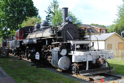 United States Plywood 2-6-6-2 11, ex. United States Plywood Corp 11 (1953-1961), exx. Kosmos Timber 11 (1950-1953), exxx. M. Bloch & Co 1950, exxxx. Weyerhauser 5 (1939-1950), nee Ostrander Railway & Timber 7 (1926-1939) built by Baldwin in 1926. It was displayed at University of Washington in 1961 then in 1974, passed to Washington Parks & Recreation then leased to NWRM and pulled the museum's trains for several years. It steamed under on power to Kenmore and was last steam engine to operate in Seattle until the American Freedom Train in 1975.