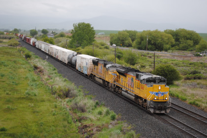 Union Pacific 8181 West stopped at North Powder. He started to move so I relocated to the US Highway 30 bridge and caught him entering the siding.