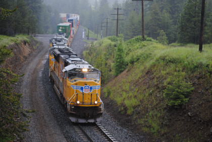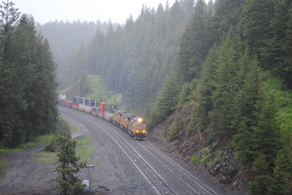 Union Pacific 8181 West. We took Oregon Highway 237 over Telocaset Hill and on the way to Union, saw an eastbound Union Pacific auto train taking the grade up Telocaset Hill in the now pouring rain. From Union we drove Oregon Highway 203 into La Grande but stopped for another train in the rain.