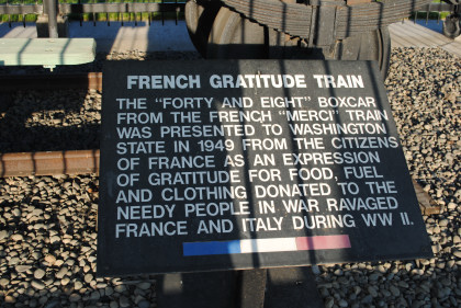 The Washington State Merci Car. The Merci Train was a train of 49 French railroad box cars filled with tens of thousands of gifts of gratitude from at least that many individual French citizens. They were showing their appreciation for the more than 700 American box cars of relief goods sent to them by (primarily) individual Americans in 1948. The Merci Train arrived in New York harbor on February 3rd, 1949 and each of the 48 American states at that time received one of the gift laden box cars. The 49th box car was shared by Washington D.C. and the Territory of Hawaii. Parades and ceremonies of welcome were conducted in the state capitols and major cities of almost all the states. The largest and most attended was in New York City where more than 200,000 people turned out to welcome that state's assigned box car.
