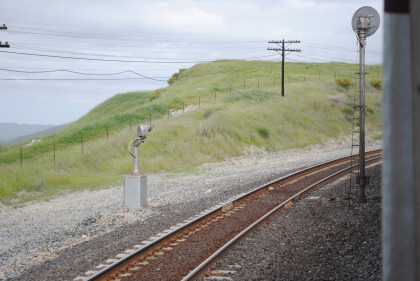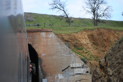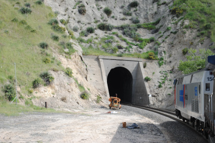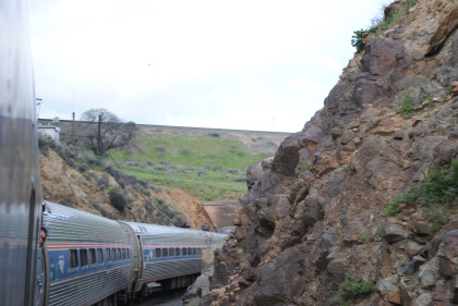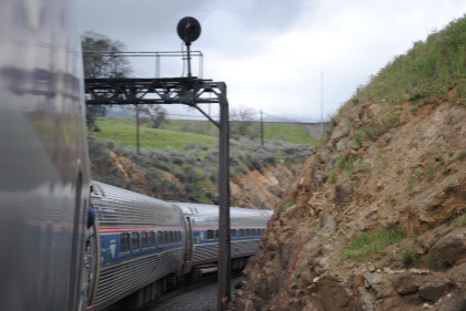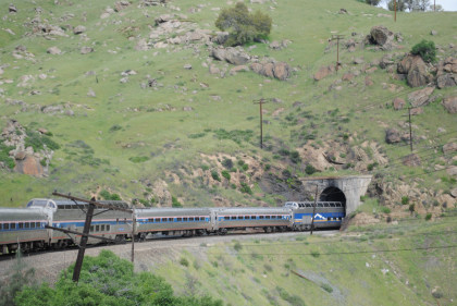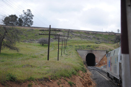 Our train exiting Tunnel 10 and I returned to my seat to write this. We climbed the grade through Marcel and Cable to Tehachapi and the summit just east of town then dropped through Monolith and Cameron before reaching the Mojave Desert, and passing through Mojave.