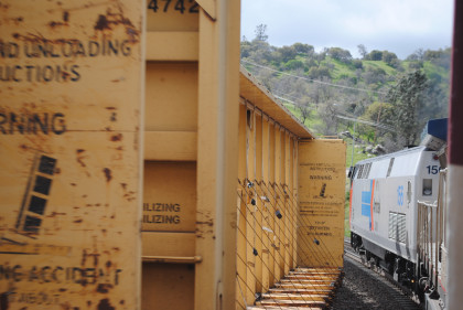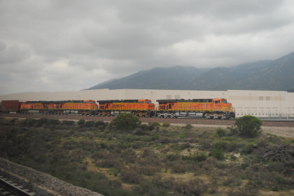 When we reached Blu Cut, a BNSF freight was running below us and finally we caught up to the front of it below Devore. I really enjoyed both days on the train over the Palmdale Cutoff.