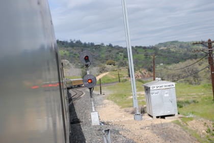 The train reached the Sunset Route and with that, our trip over the Palmdale Cutoff came to a close. We ran straight through West Colton Yard to our next station stop at Ontario then from there, headed back to LAUPT. At CP Valley, we were stopped by a red signal and the eastbound Sunset Limited went by us on its way to New Orleans.