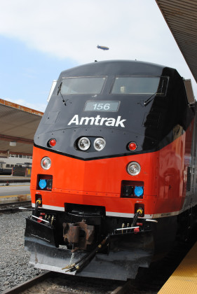 Amtrak 165 with the Goodyear blimp floating above.