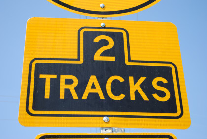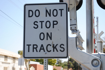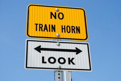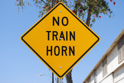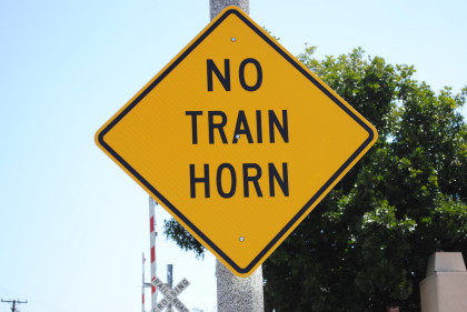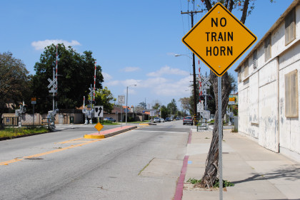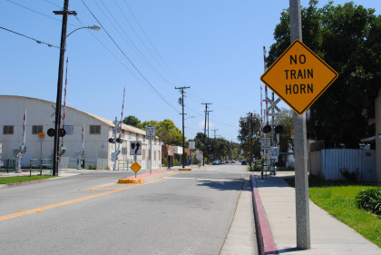 The northeast pedestrian crossing has the No Train Horn and Look Both Ways signs. I saw Pacific Surfliner 572 coming out of the Orange curve and set up for the next set of pictures.