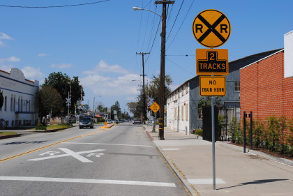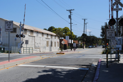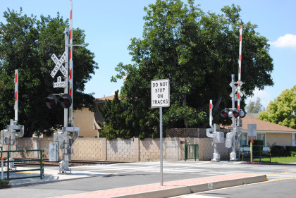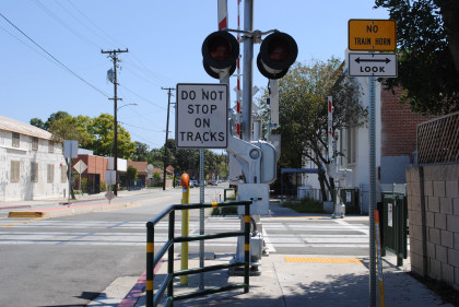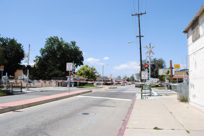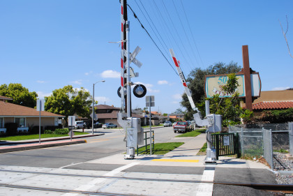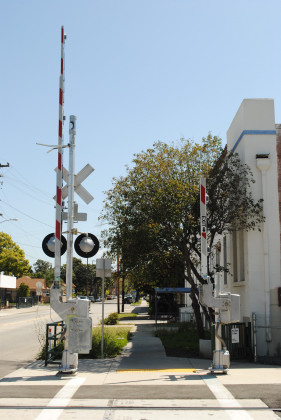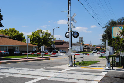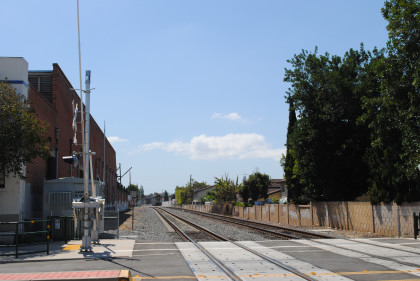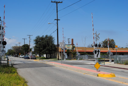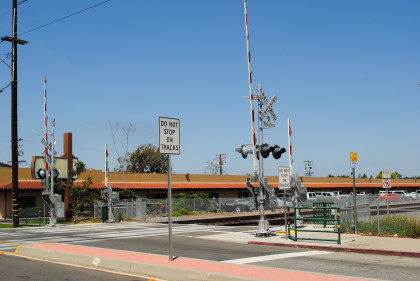 After my morning round trip train ride from Santa Ana to Solana Beach, I went home with an idea. Why not go up to Orange and take pictures at the brand new Quiet Zone crossing at Almond Avenue? I drove there and parked in the lot on the northwest side of the crossing and started my picture taking.