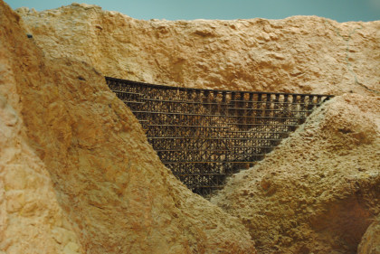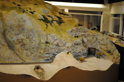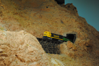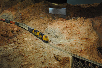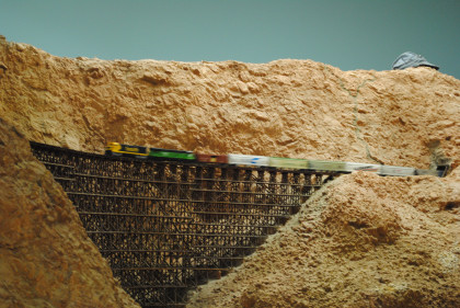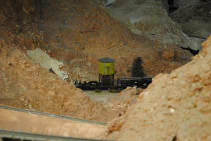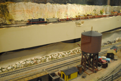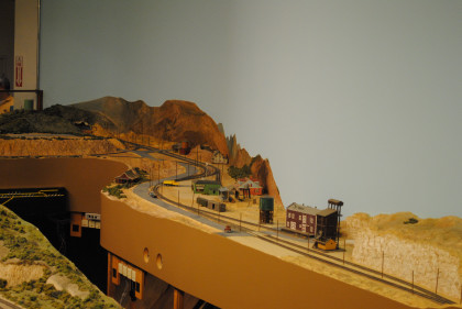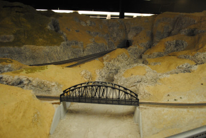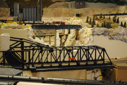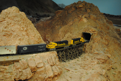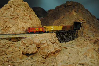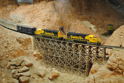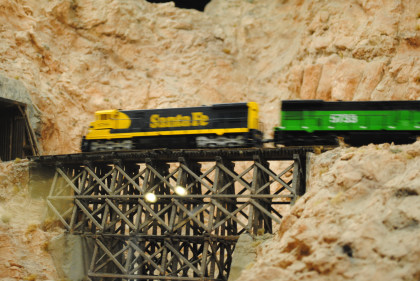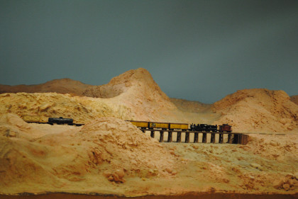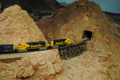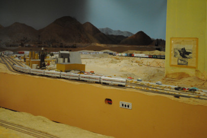 The next layout we will look at is the San Diego & Arizona Eastern Railroad's HO scale (1/87th actual size) layout. This 4,500 square foot layout is based on the prototype San Diego and Arizona Eastern Railway line from San Diego Union Station eastward through spectacular Carriso Gorge to the desert floor at El Centro. It is also owned by the San Diego Model Railroad Club. HO is the most popular scale in model railroading. This layout features an impressive 10 foot high model of the Carriso Gorge (north of Jacumba in eastern San Diego County) and the Goat Canyon trestle. The actual trestle was the largest timber railroad trestle in the world at the time of its construction in 1932. Because of the rough terrain, the SD&AE has been coined "The Impossible Railroad". The San Diego Model Railroad club meets every Friday evening.
