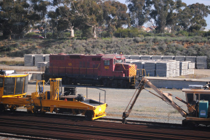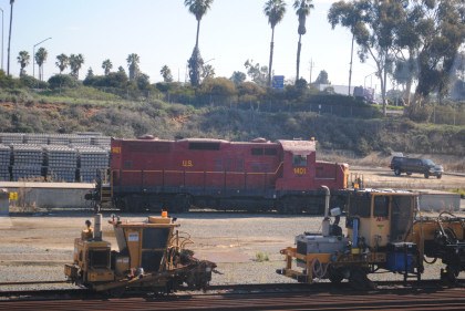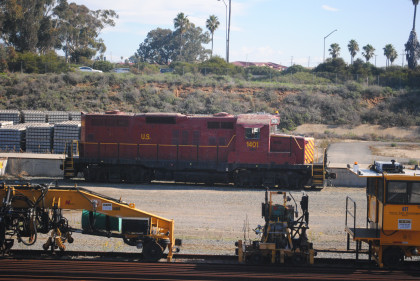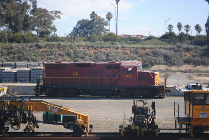 United States Army GP9 1401 is really Southern Pacific GP9 5873 built by Electro-Motive Division in 1959. It was among the last GP9s built by EMD for an American customer, and the only order of low nose GP9s built for a major railroad. It was re-numbered 3709 in 1965. In February 1987 it was sold to the United States Army Transportation School as their 002. Later it became Department of Transportation 1401 and then the United States Marine Corps 296619. At one time the lettering on the side said U.S. Army, but the Army portion has since been painted out – most likely because this unit has been assigned to the USMC's Camp Pendleton.